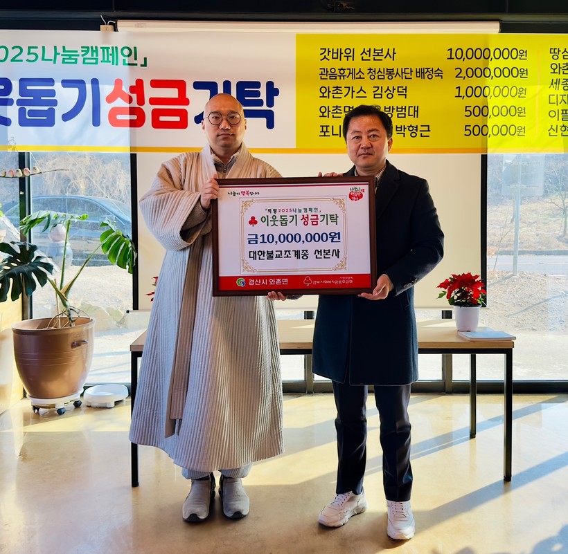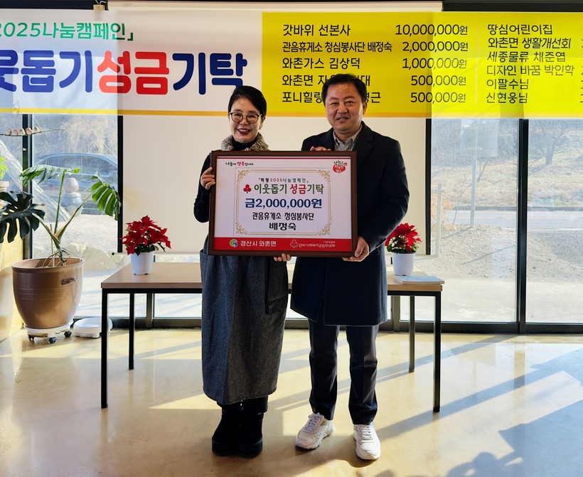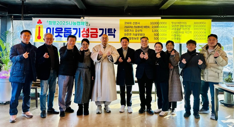 12일 '희망2025나눔캠페인'에 갓바위 선본사 1000만 원 기부를 시작으로 뒤이어 관음휴게소 청심봉사단 배정숙 200만 원,불굴사 200만 원, 와촌가스 김상덕 100만 원, 와촌면 자율방범대 50만 원, 포니힐링농원 박형근 50만 원, 땅심어린이집 30만 원, 와촌면 생활개선회 20만 원, 세종물류 채준엽 20만 원, 디자인 바꿈 박인학 20만 원, 와촌파출소장 임도형 10만 원, 이팔수님 10만 원, 신현웅님 10만 원을 각각 기탁하며 기부 릴레이를 이어가고 있다.