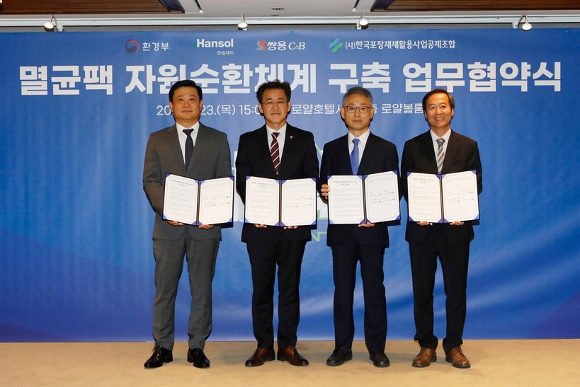 서울 중구 로얄호텔서울에서 열린 이날 협약식에는 한철규 한솔제지 대표, 임상준 환경부 차관, 정창석 쌍용 C&B 대표, 김동진 한국포장재재활용사업공제조합 이사장이 참석했다.