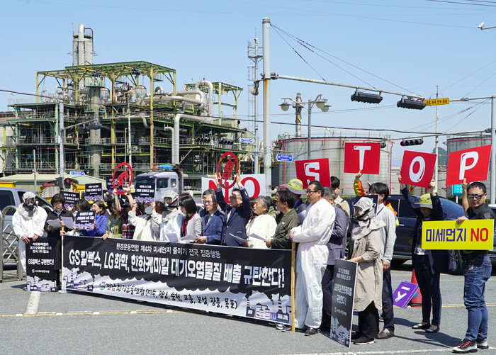 ▲환경단체가 대기오염물질배출 수치 조작과 관련 LG화학 등 규탄 기자회견을 갖고 있다.(사진=newsis) |