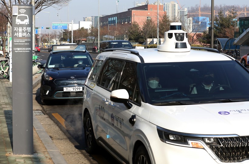 ▲서울 마포구 자율주행자동차 시범운행지구 디지털미디어시티역 앞에서 자율주행차가 승객을 기다리고 있는 모습. (사진=뉴시스)