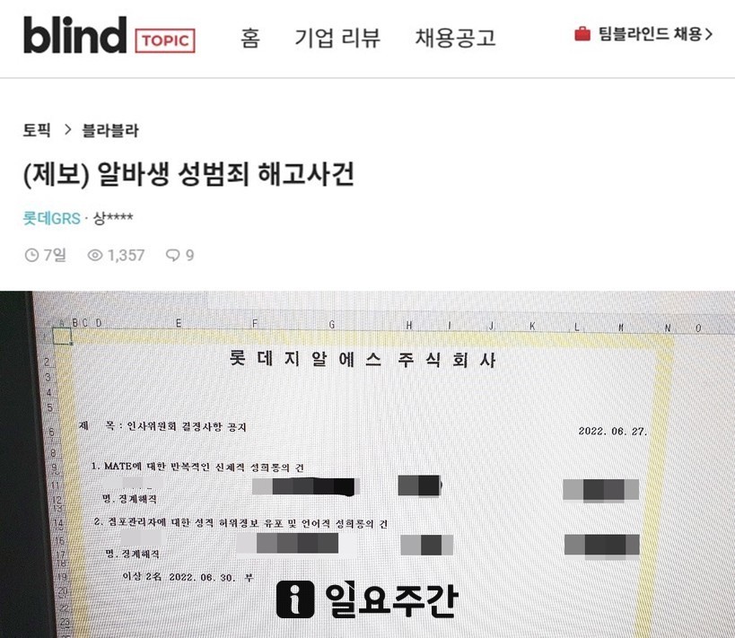 11일 직장인 익명 커뮤니티 ‘블라인드’에는 ‘롯데GRS’ 소속 직원이 ‘(제보) 알바생 성범죄 해고사건’이란 제목의 글을 올라왔다.