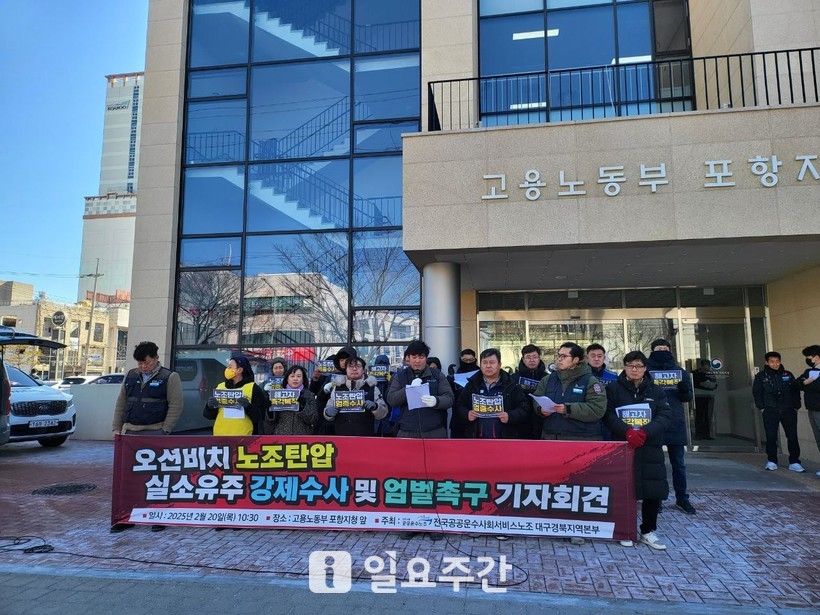 지난 20일 전국공공운수사회서비스노동조합 대구경북지역본부, 민주노총 포항지부는 고용노동부 포항지청 앞에서 ‘오션비치 노조탄압 실소유주 강제수사 및 엄벌촉구’ 기자회견을 열고 이같이 목소리를 높였다.