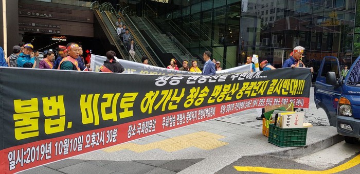 ▲ 지난 10일 ‘청송면봉산 풍력저지연합대책위원회’는 서울시 종로구 소재 금호산업 본사 앞에서 청송면봉산풍력발전단지조성사업 시공사 계약을 체결한 금호산업을 규탄하는 집회를 열었다. |