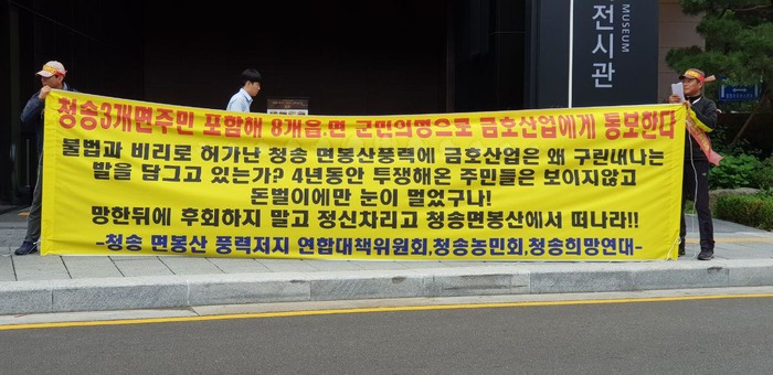 그러면서 “청송 3개면 주민 포함해 8개 읍면 군민의 명으로 금호산업에게 통보한다. 불법과 비리로 허가난 면봉산풍력에 금호산업은 왜 구린내나는 발을 담그고 있는가? 4년 동안 투쟁해온 주민들은 보이지 않고 돈벌이에만 눈이 멀었다"며 금호산업의 시공 계약 전면 백지화를 요구했다.