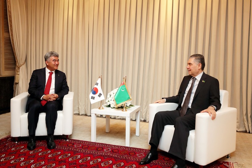| ▲ 대우건설 정원주 회장이 지난 2022년 11월 방한한 ‘구르반굴리 베르디무하메도프’ 투르크메니스탄 국가최고지도자 겸 인민이사회의장을 예방할 때 모습. (사진=대우건설 제공) |