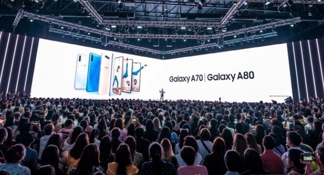 | ▲ 지난 4월 10일(현지시각) 태국 방콕에서 진행된 'A 갤럭시 이벤트' 참석자들이 '갤럭시 A80'와 '갤럭시 A70'를 소개하고 있다.(사진=삼성전자 제공) |