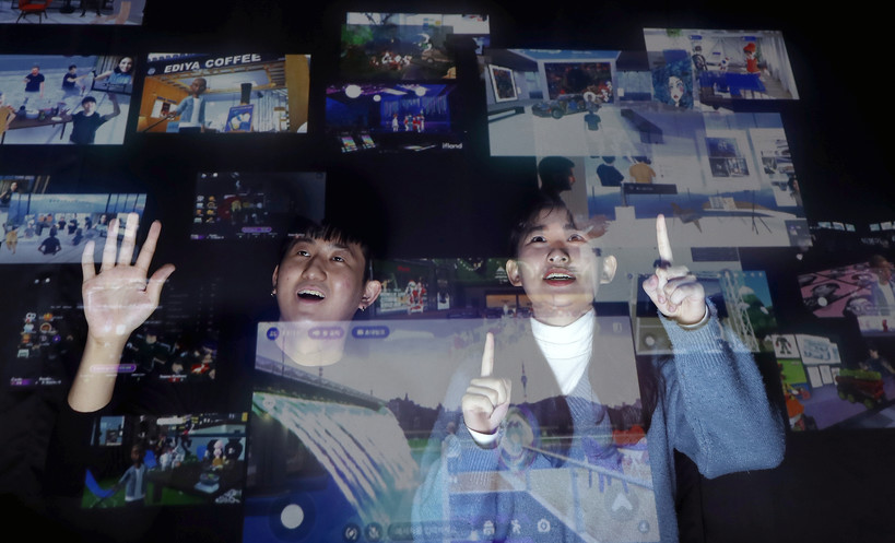 ▲MZ세대 조자홍(21)씨와 윤지원(21)씨가 홀로그램 영상을 통해 네이버 제페토, SK텔레콤 이프랜드, 스페이셜, 로블록스 등 메타버스 플랫폼 공간을 살펴보고 있다.(사진=newsis) |