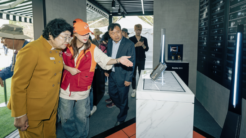 특히 최신 AI 메모리 반도체인 HBM3E 12단 제품을 형상화한 대형 투명 아크릴 조형물을 설치하고 그 안에 수백 킬로그램의 볍씨를 넣어, 제품의 메모리 처리 용량·능력을 알기 쉽게 표현했다.