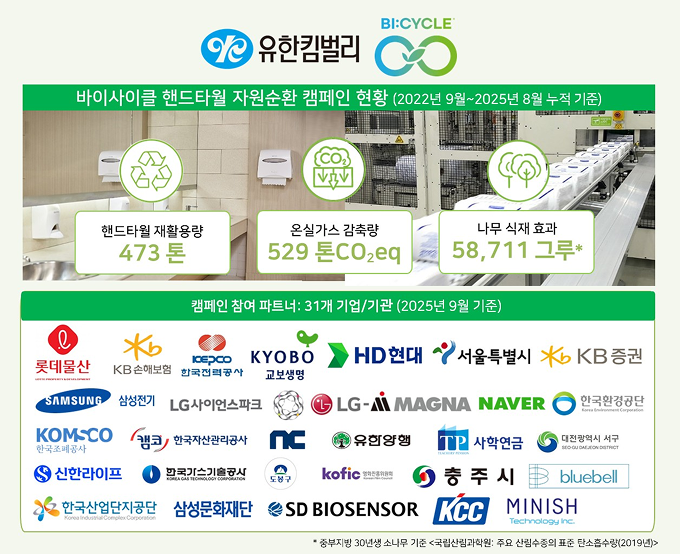[일요주간=노현주 기자] 유한킴벌리(대표이사 사장 이제훈)는 핸드타월 자원순환 사업인 ‘바이사이클(BI:CYCLE)’ 캠페인을 통해 3년 만에 누적 500톤의 온실가스 저감 성과를 달성했다고 25일 밝혔다. 이번 성과는 2022년 9월 본격화된 핸드타월 자원순환 사업을 통해 LCA 전과정평가 및 제3자 검증을 거쳐 객관적으로 산정된 수치다.