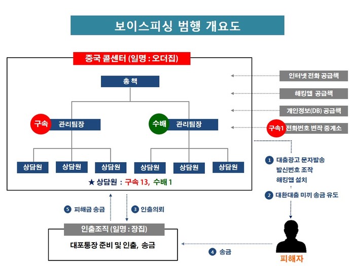 ▲ 지난 4월 부산경찰청 지능범죄수사대에 검거된 보이스피싱 조직의 범행 개요도.(사진=부산경찰청 제공) |