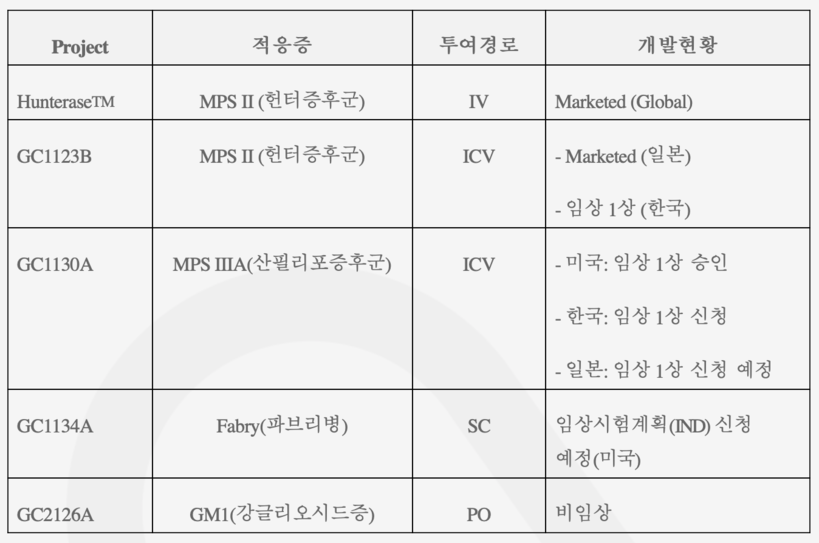 GC1130A는 중추신경계에 투여할 수 있는 자사의 고농축 단백질 제제 기술을 산필리포증후군(A형) 치료제에 적용해 개발하고 있는 바이오신약으로 치료제를 뇌실 안에 직접 투여해 치료 효과를 높이는 방식이다. 이 방식(ICV, Intracerebroventricular injection)은 당사의 헌터증후군 치료제인 ‘헌터라제’에 세계 최초로 적용해 일본에서 품목허가를 획득한 바 있다.