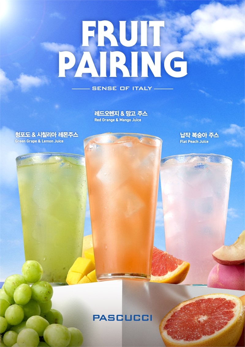 1일, 파스쿠찌에 따르면 신제품은 ‘프루트 페어링(Fruit Pairing)’을 콘셉트로, 여름철 인기 과일의 맛과 향, 색감을 살린 것이 특징이다. 출시된 음료는 ‘레드 오렌지와 망고를 조합한 레드 오렌지&망고 주스’, ‘청포도에 시칠리아산 레몬을 더한 청포도&시칠리아 레몬 주스’, ‘납작 복숭아를 활용한 납작 복숭아 주스’ 등 총 세 가지다.
