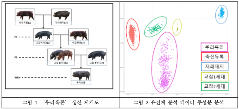 연구진은 ‘우리흑돈’의 유전적 특성을 명확하게 밝히기 위해 계통 개발에 이용된 국내 재래돼지, 축진듀록, 교잡1세대(축진듀록×재래돼지), 교잡2세대(교잡1세대×축진듀록) 등 4개 집단과 ‘우리흑돈’의 유전체 정보를 이용해 집단 비교 분석을 진행했다.