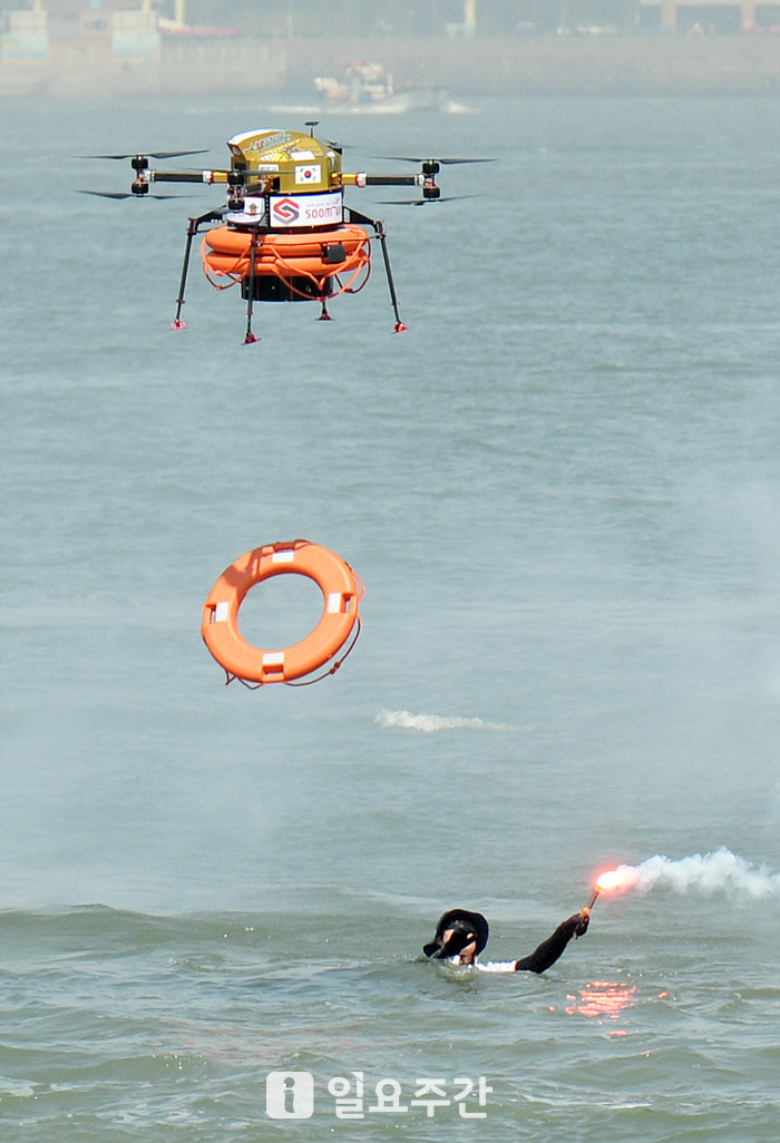 | ▲ 재난 대비 해상훈련에서 드론이 익수자에게 튜브를 전달하고 있는 모습. |