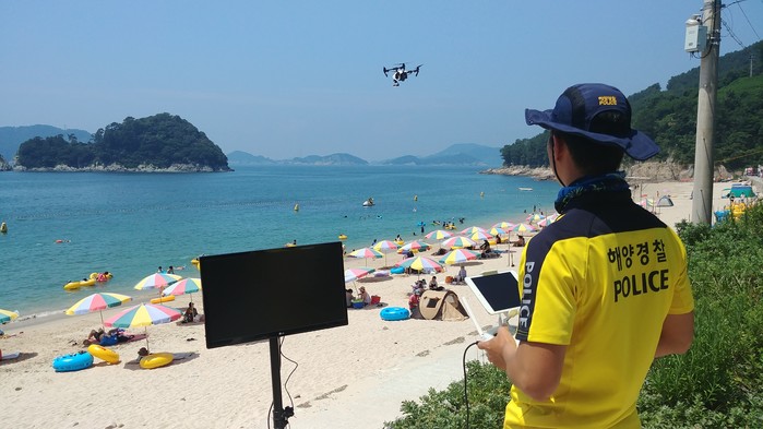 | ▲ 해양경찰이 해수욕장에 드론을 띄워 해상안전에 만전을 기하고 있는 모습.(사진=통영해경 제공) |
