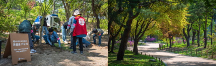 | ▲ 2025 (좌) 유한킴벌리 사원가족과 시민의 궁궐숲 가꾸기 참여 현장 (우) 유한킴벌리가 가꾼 창경궁 율곡로 일대. (사진=유한킴벌리 제공) |