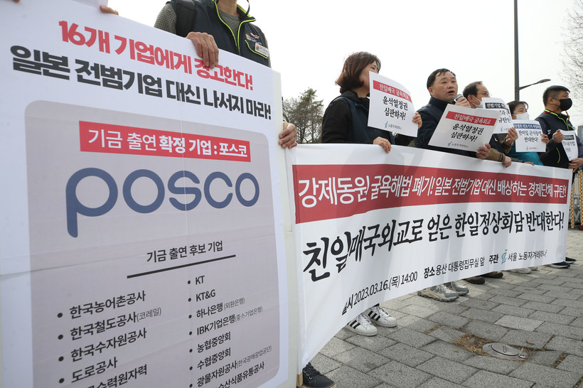 [일요주간 = 김성환 기자] 일제 강제징용 피해배상금을 한국 기업이 마련하는 방안을 추진하겠다는 윤석열 정부의 지난 6일 관련 발표가 나온 뒤 부정적인 여론이 들끓고 있다. 서울대학교와 고려대학교 등에서 교수들이 집단으로 반발하며 ‘강제징용 피해배상금을 한국 기업에 떠넘기기로 한 방침을 철회하라’며 시국선언을 발표하는 등 반발이 거세지고 있다.