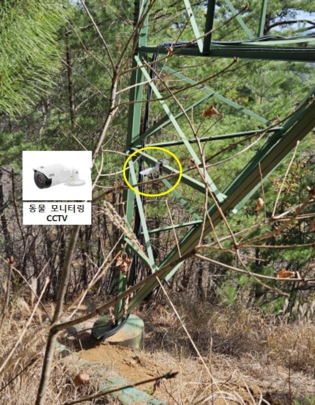 | ▲ 시범철탑에 설치된 동물 모니터링용 cctv(노란색 원안쪽) 및 확대 이미지 (사진=한전) |