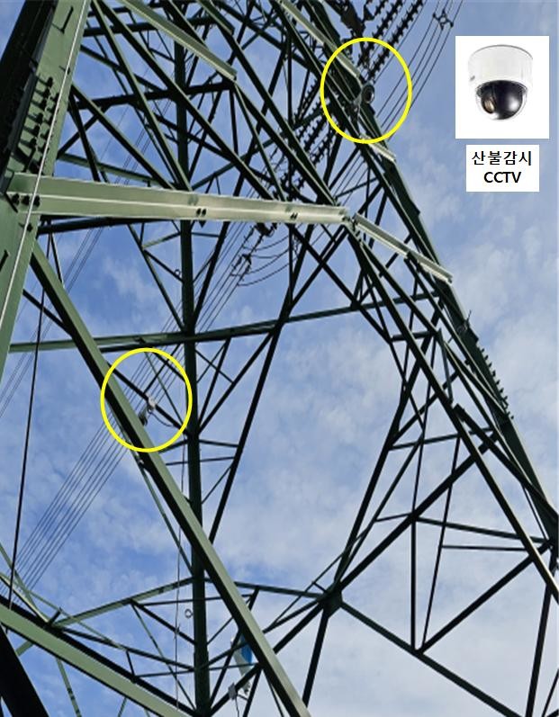 | ▲ 시범철탑에 설치된 산불감시용 cctv(노란색 원안쪽) 및 확대 이미지 (사진=한전) |
