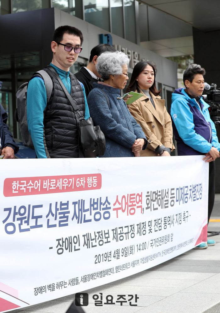 장애인 인권단체 ‘장애의 벽을 허무는 사람들’은 지난 9일 고성 산불 당시 수어 통역과 화면해설을 제공하지 않은 것은 차별이라며 국가인권위원회에 진정을 냈다. 이들은 지상파 방송사에 수어 통역을 의무화하고, 화면해설 제공 기준 마련과 전문 인력을 구성해야 한다고 촉구했다.