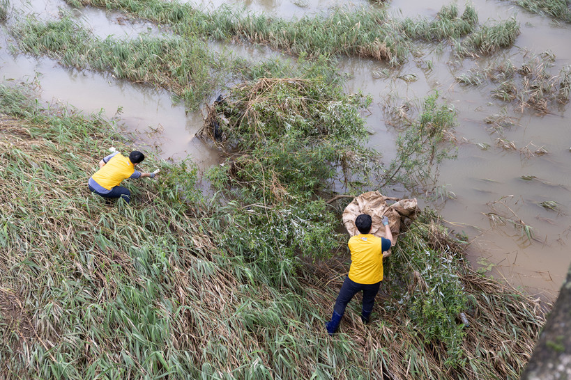 | ▲ 한국서부발전은 24일 충남 공주시 이인면 일대에서 수해 피해 복구지원에 나섰다. 사진은 서부발전 직원들이 하천에 유실된 가축 사료 포대를 수거하는 장면(사진=서부발전) |