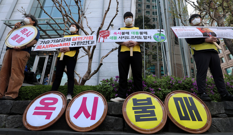| ▲ 환경보건시민센터 회원들이 지난 4월 26일 오후 서울 여의도 옥시 본사 앞에서 가습기살균제 기업 규탄 및 불매운동을 촉구하는 기자회견을 하고 있다. <사진=뉴시스> |