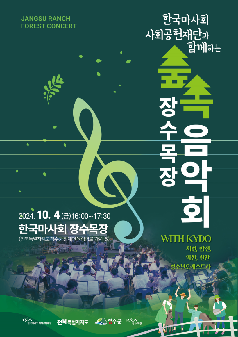 [일요주간 = 김성환 기자] 한국마사회(회장 정기환)는 전북특별자치도 출범 후 발전을 기원하는 농어촌 청소년 오케스트라(KYDO, Korea Young Dream Orchestra) 숲속 야외 음악회를 오는 10월 4일 장수목장에서 개최한다고 25일 밝혔다.