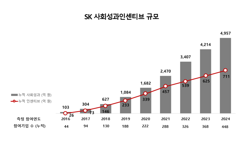 10년 간 448개 사회적 기업이 창출한 사회적 가치는 누적 약 5000억 원이고 SK가 사회적 기업에 지급한 현금 인센티브는 711억 원이다(2024년 9월 약 90억 원 지급 예정 포함).