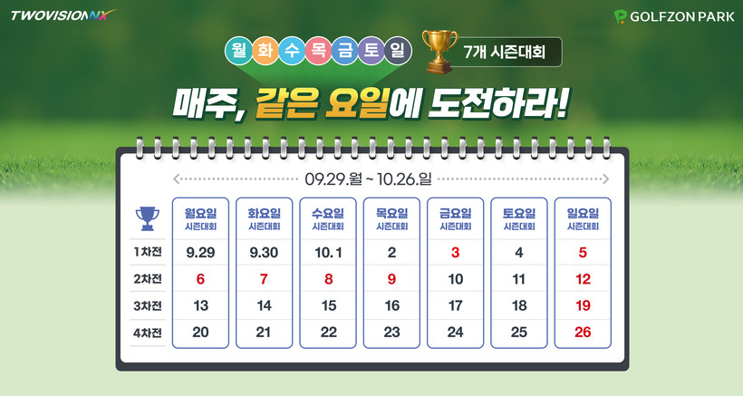 - 월요일부터 일요일까지 7개의 시즌대회, 1~4차전까지 18홀 완료 회원 대상으로 상금 지급