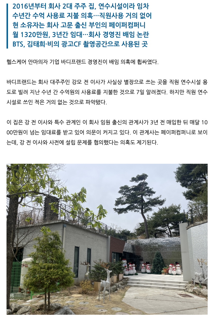 앞서 지난 7일 ‘UPI뉴스’는 경기도 가평군 청평면 대성리에 위치한 ‘프랜드 아트 갤러리’로 잘 알려진 이 장소는 직원 연수시설로 쓰인 적이 거의 없는 것으로 파악됐다며 “강 전 이사와 특수 관계인 이 회사 임원 출신의 관계사가 3년 전 주택을 매입한 뒤 매달 1000만 원이 넘는 임대료를 받고 있어 의문이 커지고 있다”며 “이 관계사는 페이퍼컴퍼니로 보이는데, 강 전 이사와 사전에 설립 문제를 협의했다는 의혹도 제기된다”고 보도했다. 해당 건물은 지난 2021년 5월 방탄소년단(BTS)이 출연한 바디프랜드 광고 촬영 장소로 사용돼 유명세를 탔던 장소이다.