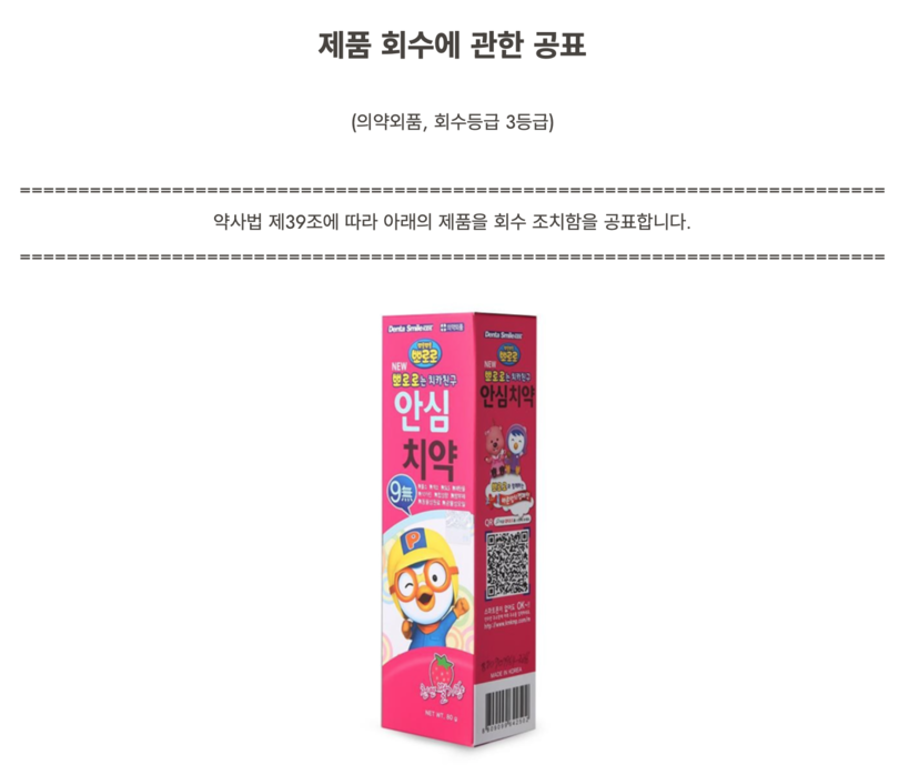전국에 대량 유통된 '뽀로로 안심 치약' 포함 총 31종 회수