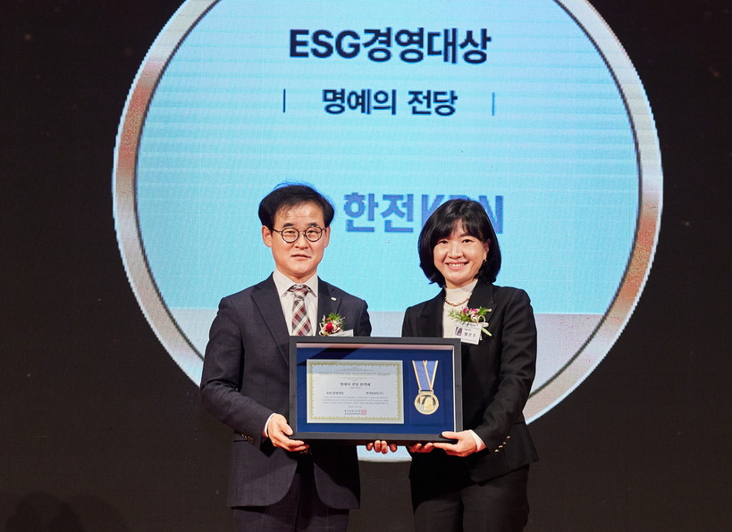 | ▲ ESG경영대상 명예의 전당 헌액패를 수령하는 신수행 한전KDN ESG경영처장(사진 왼쪽) (사진=한전KDN) |
