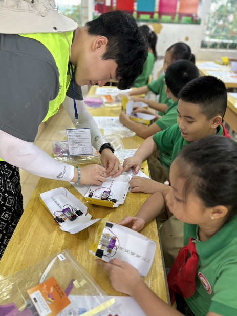 ▲ 지난해 6월 LS 대학생 해외봉사단 26기 단원이 베트남 하이퐁시에서 초등학생들에게 '태양전지자동차 만들기' 교육 프로그램을 진행하고 있다. (사진=LS그룹 제공) |