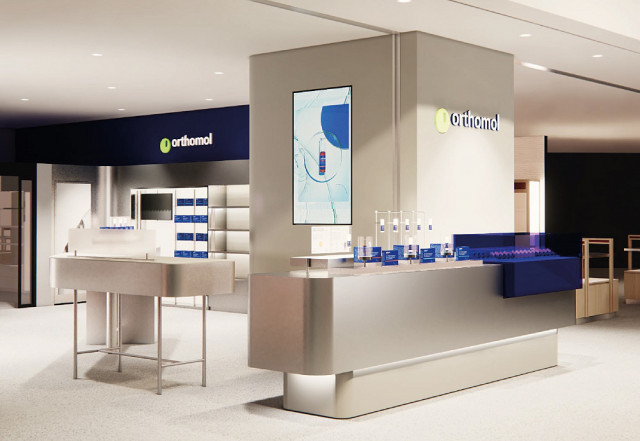 이 플래그십스토어는 롯데백화점 잠실점 지하 1층의 건강식품 전문 코너에 위치하며 오쏘-몰레큘러'라는 미세영양소 연구를 기반으로 한 오쏘몰의 과학적 이미지를 반영한 연구소 컨셉으로 구성됐다. 이를 브랜드 키 컬러와 은색, 시험관을 연상시키는 전면과 정돈된 제품 진열대를 통해 구현했다.