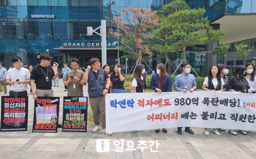 전국화학섬유식품산업노동조합(이하 화섬식품노조) 락앤락지회는 지난 14일 락앤락 본사가 있는 그랜드센트럴(서울역 인근) 앞에서 락앤락노조가 경영진과 대주주를 규탄하는 선전전을 진행했다.