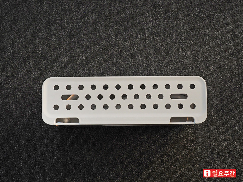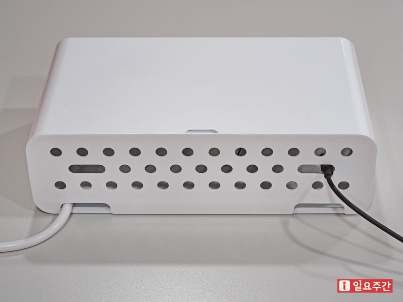 박스탭의 후면의 모습이다. 캡 방식으로 본체에 장착되는 뒷판 부분은 혹시라도 발생할지 모르는 열을 배출하기 위해 디자인을 살리며 효율적으로 구멍이 뚫려 있다. 흔히 전기 장치를 설치할 때는 과열 방지를 위해 벽과 얼마간의 거리를 떼어두라고 조언한다. 이 제품은 벽으로 끝까지 밀어넣더라도 플러그 사이에 공간이 충분히 마련되어 있기 때문에 사용에 아우 문제가 없다.