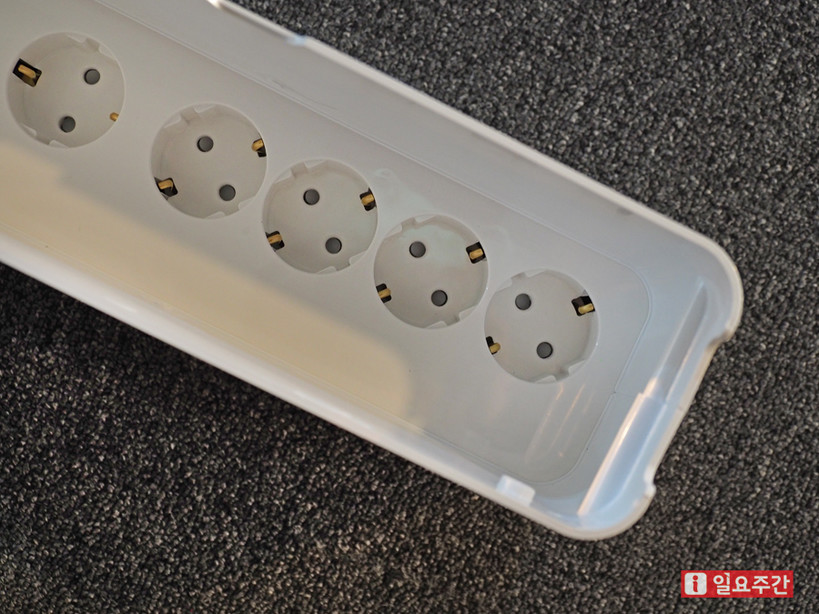 맨 왼쪽의 플러그는 단독으로 배열되어 있다. 다른 4개의 플러그와는 달리 공간을 확보하고 있는데 이는 헤드가 큰 가전제품용으로 생각할 수 있다. 특히 신경써서 배치한 방향은 단연 돋보인다. 꺾이지 않거나 방향이 독특한 케이블은 여기에 두면 된다.