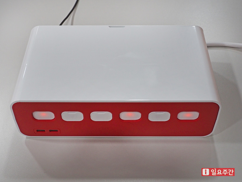 각각의 버튼을 뒤쪽에 전원 LED가 달려 있다. 버튼을 누르면 켜지는 방식으로 지금은 흰색 무지 버튼일 뿐이지만 앞쪽에 해당되는 제품 스티커를 붙이면 인테리어의 완성을 느낄 수 있다.