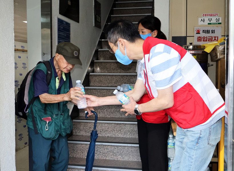 [일요주간 = 김성환 기자] 희망브리지 전국재해구호협회(회장 임채청)가 기록적인 폭염으로 고통받는 재난취약계층을 돕기 위해 서울역 인근 노숙인 무료급식소 ‘따스한채움터’에서 생수 나눔 활동을 진행했다고 26일 밝혔다.