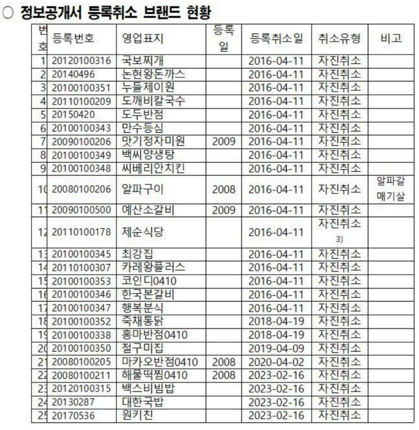 2008년 8월 ‘원조쌈밥집’, ‘본가’, ‘새마을식당’, ‘알파갈매기살’ 등으로 최초 등록 이후 2023년 말까지 총 50개 브랜드의 정보공개서를 공정위에 등록했다. 이 중 절반인 25개 브랜드는 자진 취소됐고 현재는 ‘빽다방’, ‘홍콩반점’, ‘롤링파스타’, ‘고투웍’ 등 25개 브랜드가 운영 중이다.