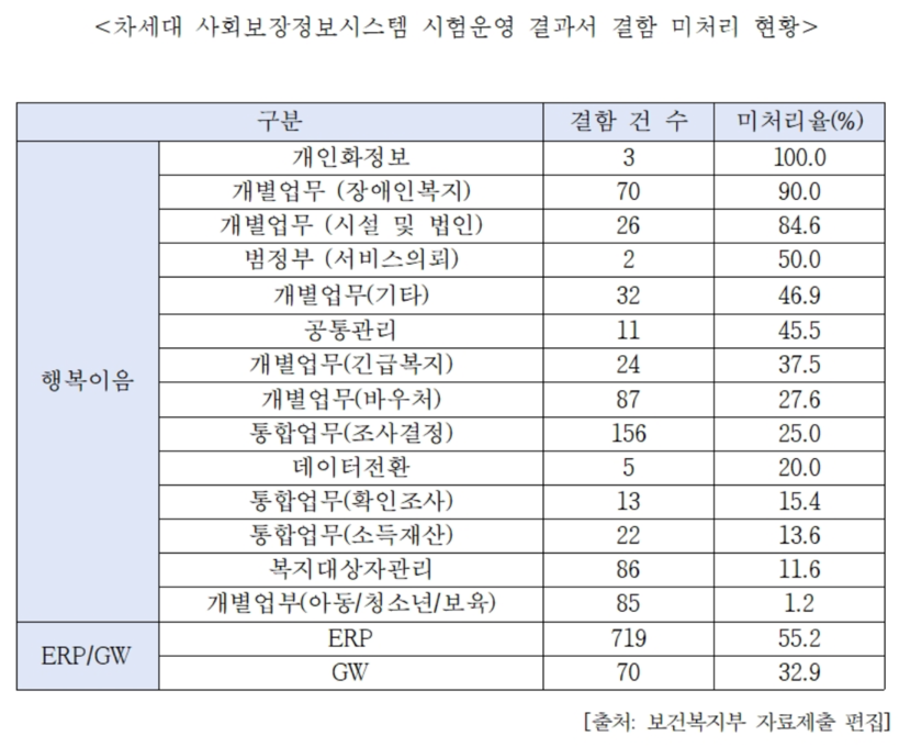 시험결과 보고서를 분석한 결과 발견된 결함 중 미조치율이 높은 것은 장애인 복지 90%, 복지시설·법인 84.6%, 긴급지원 37.5%, 수당 바우처 27.6% 등 취약계층·긴급지원 대상자에게 집중돼 있다.