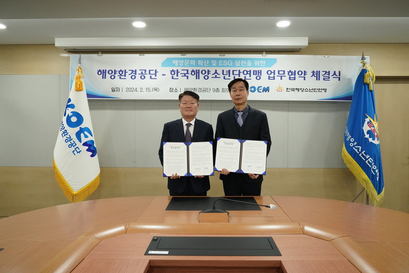 [일요주간=김영란 기자] 해양환경공단(KOEM, 이사장 한기준)은 15일 공단 본사에서 한국해양소년단연맹(총재 김경배)과 해양문화 확산 및 ESG 실천을 위한 업무협약을 체결했다.