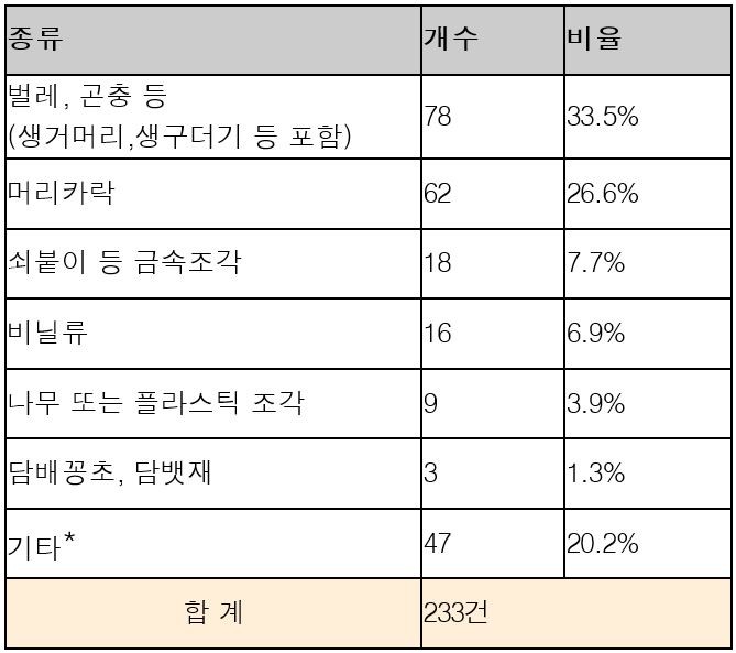 발견된 이물질 종류로는 벌레와 곤충류가 가장 많은 78건을 기록했고, 머리카락이 68건으로 비슷하게 많이 발견됐다. 이외에도 쇠붙이 등 금속조각(18건), 비닐류(16건), 나무 또는 플라스틱 조각(9건) 순으로 다수 발견됐다.