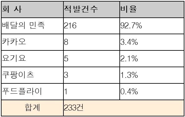배달앱 주문음식의 이물질 신고법이 시행된 기간 신고현황을 살펴보면 업체별로는 '배달의 민족'이 216건으로 92.7%로 대부분을 차지했다. 그 뒤를 '카카오' 8건, '요기요' 5건, '쿠팡이츠' 3건, '푸트플라이' 1건이 신고됐다. 지역별로는 서울이 122건으로 절반이상을 차지했고, 경기도 33건, 부산 14건, 인천 13건으로 뒤를 이었다.