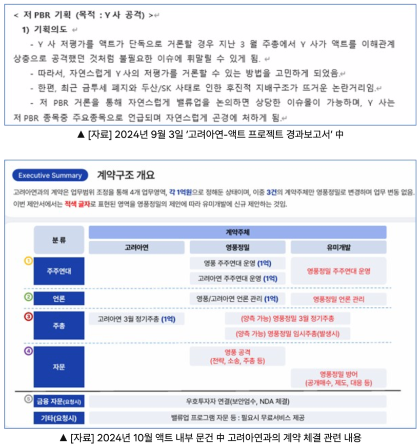 또한 영풍은 “액트와의 계약 일부가 최 회장의 특수관계사인 영풍정밀(현 KZ정밀)로 변경된 점, 이후 이사회 진입을 위한 협의가 지속된 점” 등을 문제 삼았다. 실제로 2025년 정기 주총 당시 영풍정밀이 이사 후보를 추천했으나 표 대결에서 패했다.