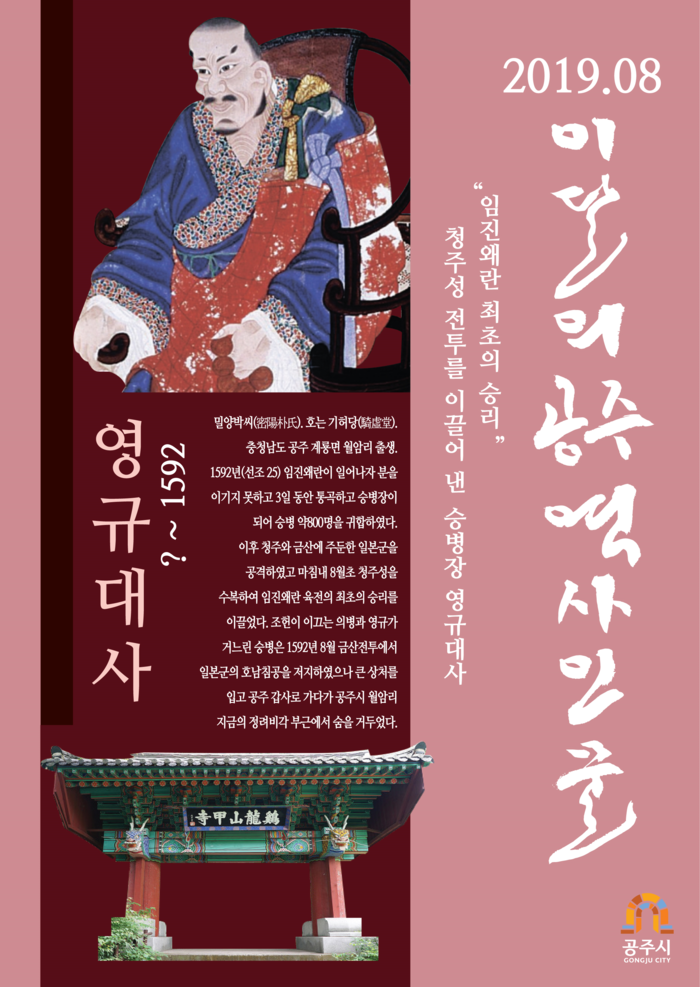 한편, 8월의 인물인 영규대사는 공주 계룡면 출신으로 임진왜란 때 최초의 의병과 최초의 육전 승리를 이끈 승병장으로 조정에서는 청주성 전투후 동지충추부사의 벼슬을 내렸다. 이후 승병이 곳곳에서 일어나는 계기가 되었으며 계룡면에 표충원, 영규대사 묘, 영규대사비가 있고 매년 추모행사가 시행되고 있다.