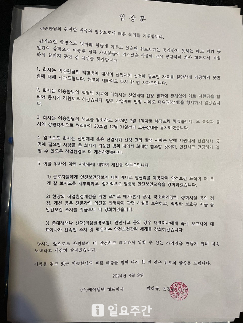 지난 9일 케이엠텍은 ‘입장문’을 통해 “이승환 씨의 완전한 쾌유와 일상으로의 빠른 복귀를 기원한다”며 “갑작스러운 발병으로 병마와 힘들게 싸우고 있을 때 회사 대표로서 세심하게 살피지 못한 점 책임을 통감한다. 회사는 이승환 씨의 백혈병에 대해 산업재해 신청에 필요한 자료를 원만하게 제공하지 못한 점과 해고에 대해 사과드린다”고 밝혔다.
