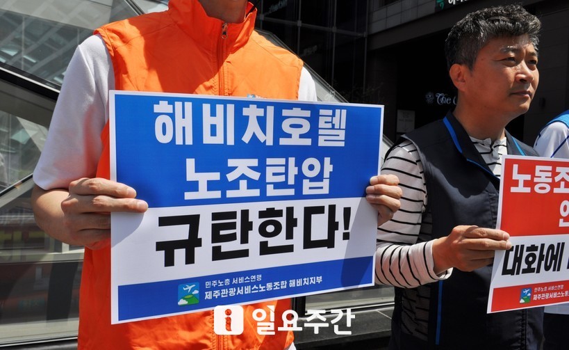 민주노총 서비스연맹 관광레저산업노조 해비치지부 등은 3일 서울 종로구 센트로폴리스빌딩 앞에서 ‘4대 악 근절’과 노조 인정 등을 촉구하는 기자회견을 열었다.