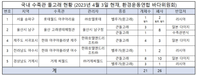 | ▲ 국내 수족관 고래류 감금 현황.(자료=환경운동연합 바다위원회 제공) |