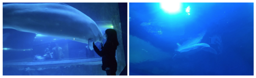 | ▲ 롯데월드 아쿠아리움에 감금된 벨라가 수조 유리벽에 몸을 부딪히거나, 수면 위에 가만히 떠있는 등의 이상행동을 보이고 있다.(사진=동물해방물결 제공) |